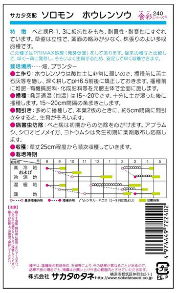 耐暑・耐寒性すぐれる豊産品種【特長】べと病R-1、R-3に抵抗性をもち、耐暑・耐寒性にすぐれ、晩夏〜晩秋まきに適します。